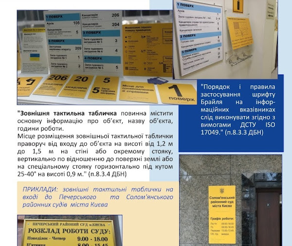 Так, наприклад, в рамках діяльності Робочої групи був реалізований проєкт «Навігація суду», який поліпшує орієнтування в приміщенні суду його відвідувачам включаючи і людей з порушенням зору через розміщення тактильних елементів та дублювання ключової інформації шрифтом Брайля.