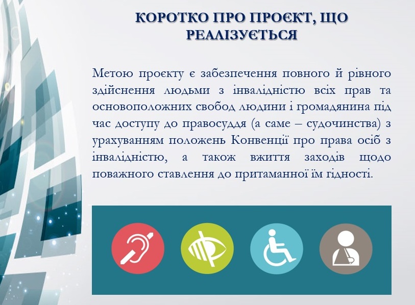 Проєкт «Інновації та розумні пристосування як інструмент доступу до правосуддя» реалізується Всеукраїнською громадською організацією інвалідів «Правозахисна спілка інвалідів» в межах Програми ООН із відновлення та розбудови миру за фінансової підтримки урядів Данії, Швейцарії та Швеції