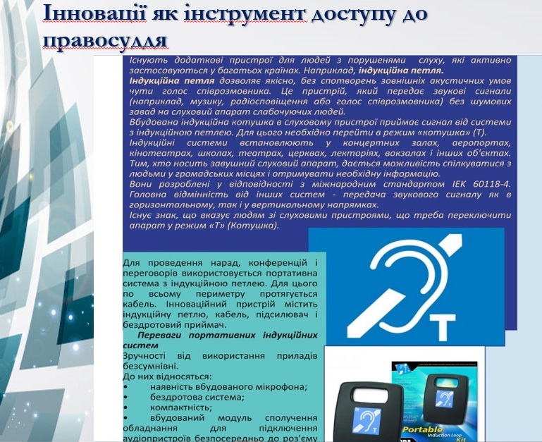 Також були згадані такі інноваційні пристосування як індукційні петлі та сучасні інформаційно-платіжні термінали, які вже встановлені та використовуються в окремих судах України. Індукційна петля є додатковим пристроєм для людей із порушенням слуху та дозволяє якісно, без спотворень зовнішніх акустичних вимог чути голос співрозмовника.