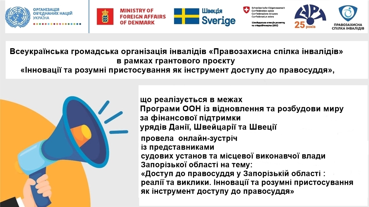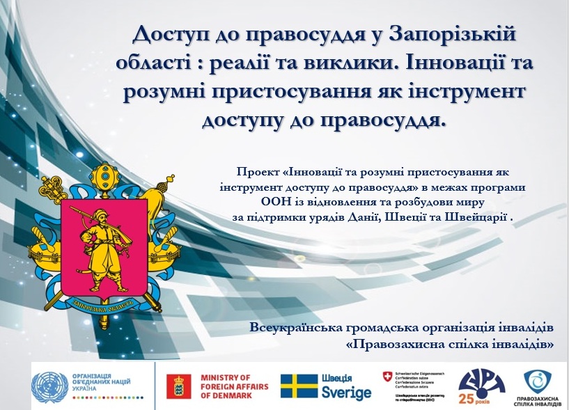 11 грудня 2020 року Всеукраїнська громадська організація інвалідів «Правозахисна спілка інвалідів» у межах проєкту «Інновації та розумні пристосування як інструмент доступу до правосуддя», що реалізується в межах Програми ООН із відновлення та розбудови миру за фінансової підтримки урядів Данії, Швейцарії та Швеції, провела онлайн-зустріч із представниками судових установ та місцевої виконавчої влади Запорізької області на тему: «Доступ до правосуддя у Запорізькій області: реалії та виклики. Інновації та розумні пристосування як інструмент доступу до правосуддя».