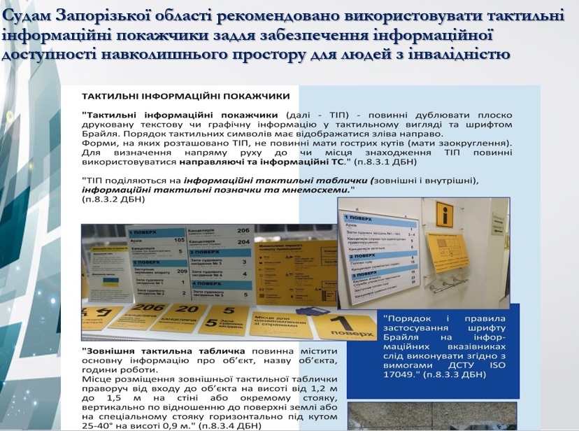 Щодо архітектурної доступності судових установ Запорізької області найбільш розповсюдженими порушеннями є: відсутність пандусів або пандуси, що облаштовані з порушенням вимог чинних ДБНів, вхідна група будівлі не відповідає вимогам чинних ДБНів, не забезпечена можливість самостійно пересуватися між поверхами людям з інвалідністю, можливість безперешкодного переміщення будівлею суду та прилеглою територією. На прикладі 3 судів Запорізької області: Господарського суду Запорізької області, Запорізького окружного адміністративного суду, Запорізького апеляційного суду було проведено аналіз щодо необхідності впровадження елементів доступності.