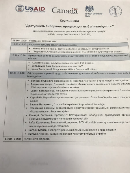 Захід мав на меті об’єднати представників Центральної виборчої комісії, державних інституцій, моніторингових організацій та організацій осіб з інвалідністю для обговорення відповідності положень українського законодавства до міжнародних стандартів щодо забезпечення повної та рівної участі людей з інвалідністю у політичних та виборчих процесах та стратегії забезпечення доступності виборчого процесу для людей з інвалідністю. Крім того, підчас круглого столу відбулась презентація «Звіту за результатами аудиту (обстеження) виборчих дільниць Полтавської області».