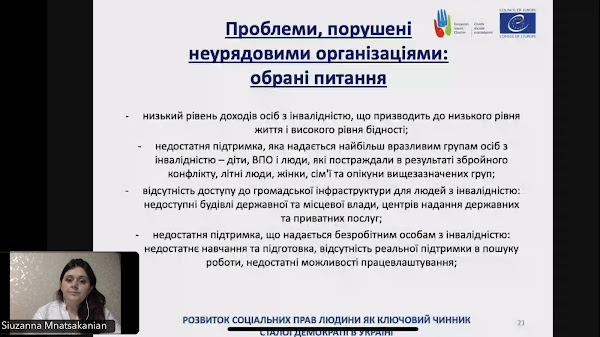 Нагадаємо, що проєкт Ради Європи «Розвиток соціальних прав людини як ключовий чинник сталої демократії в Україні» 10 лютого 2020 року розпочав міжнародну місію з оцінки потреб законодавства та практики його застосування у сфері забезпечення прав людей з інвалідністю в Україні відповідно до статті 15 Європейської соціальної хартії.