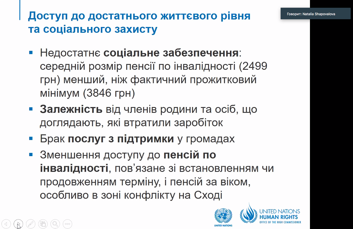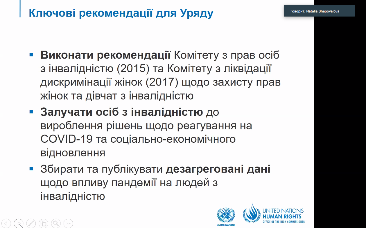 Модератором заходу було презентовано Інформаційну записку «Вплив пандемії COVID-19 на людей з інвалідністю в Україні» підготовлену Моніторинговою місією ООН з прав людини.