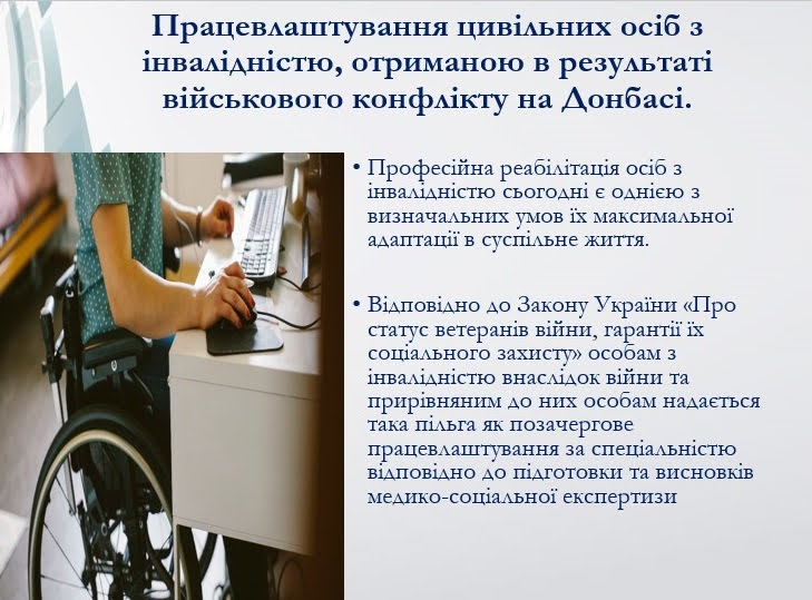 Професійна реабілітація осіб з інвалідністю сьогодні є однією з визначальних умов їх максимальної адаптації в суспільне життя. Відповідно до Закону України «Про статус ветеранів війни, гарантії їх соціального захисту» особам з інвалідністю внаслідок війни та прирівняним до них особам надається така пільга як позачергове працевлаштування за спеціальністю відповідно до підготовки та висновків медико-соціальної експертизи. Доповідачвказав, що цивільна особа з інвалідністю, отриманою в результаті військового конфлікту на Донбасі може потребувати опанування нових навичок або і нової професії, так як отримані травми можуть стати перепоною для здійснення тієї трудової діяльності, яку людина здійснювала раніше (наприклад, втрата зору для водія). Держава має створювати умови задля отримання людиною нової професії та сприяти професійній інтеграції.
