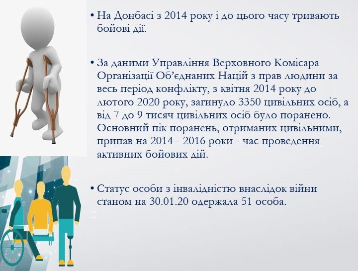 Спікерка зазначила, що проблема захисту прав і свобод людини постає особливо гостро в період військового конфлікту в Україні. Більшість цивільних осіб, які отримали інвалідність внаслідок поранення, проживають на територіях, на яких велися і все ще ведуться бойові дії. На цих територіях відсутня більшість державних і комунальних послуг, або доступ до них значно ускладнено; дуже обмежені можливості працевлаштування. У зв’язку з цим одним з небагатьох постійних і стабільних джерел доходів для осіб з інвалідністю, отриманою в результаті військових дій, залишається соціальне забезпечення, що надається державою. Цивільне населення потребує розумних, нормативно забезпечених видів соціальної допомоги, у тому числі, для покриття витрат на лікування тих, хто отримав поранення та інвалідність внаслідок бойових дій. Було зазначено, що 22 травня 2018 року для забезпечення життєвих потреб осіб з інвалідністю в результаті війни в Закон про статус ветеранів війни, гарантії їх соціального захисту були внесені доповнення, згідно з якими дію закону було розширено також на цивільних осіб, які отримали поранення в результаті військових дій на Донбасі. Проте, з моменту вступу закону в силу і станом на 01.11.2020 р., статус особи з інвалідністю внаслідок війни отримали трохи більше ніж 100 осіб, але основна маса поранених цивільних осіб все ще не забезпечена належною соціальною допомогою