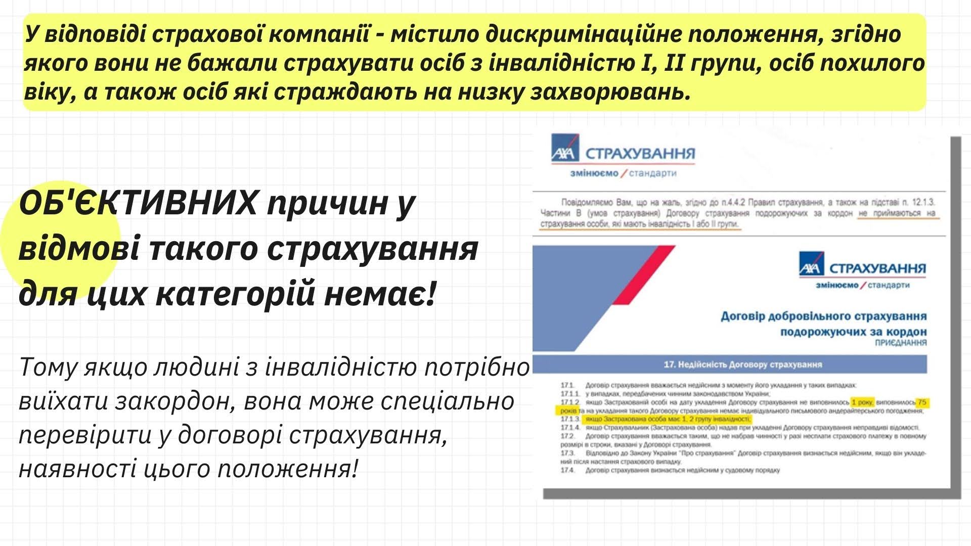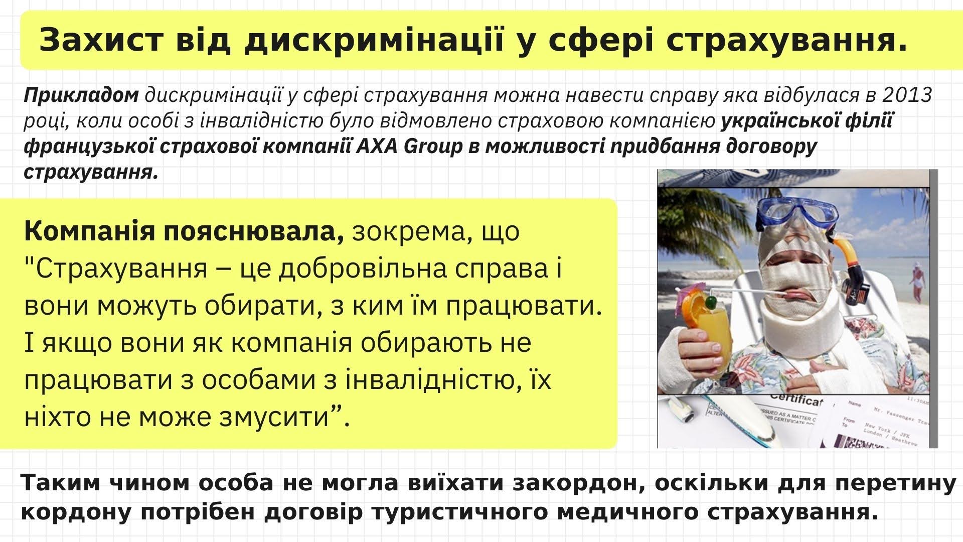 4) інформацію про реальний кейс спікера з приводу судової справи відносно дискримінації людини з інвалідністю за ознакою інвалідності у сфері страхування.