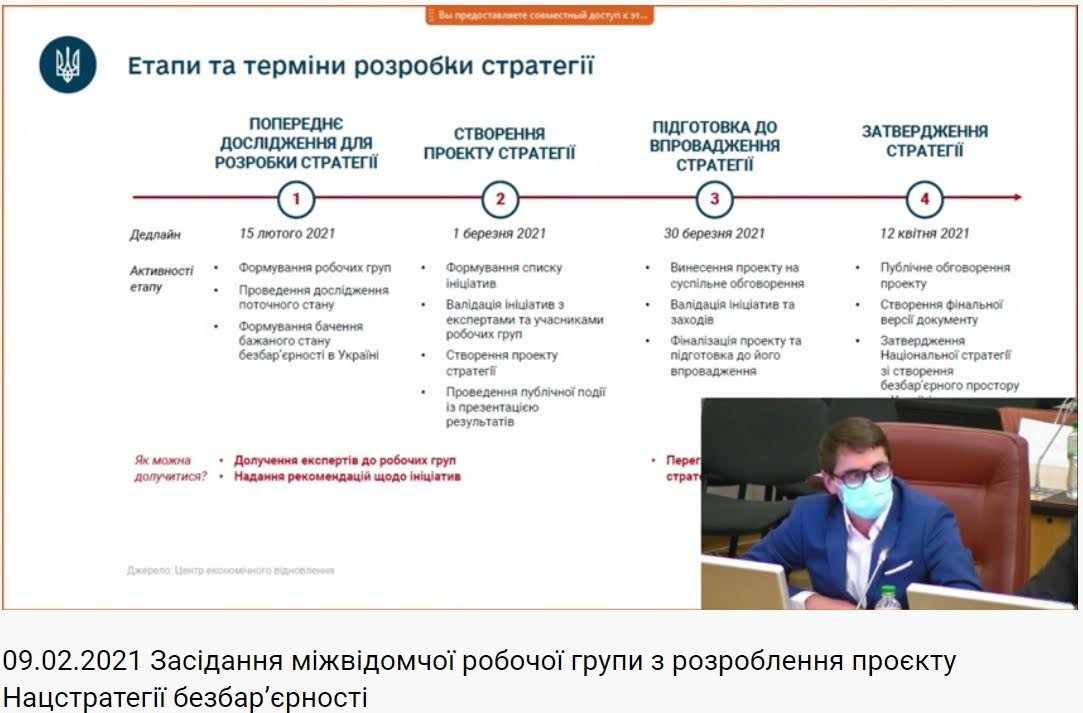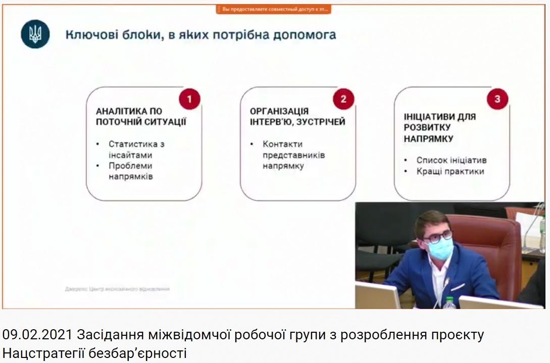 09 лютого 2021 року відбулося перше засідання міжвідомчої робочої групи з розробки Національної стратегії безбар’єрності на якому учасники заходу визначалися з подальшим планом роботи та виокремили шість основних напрямів з формування безбар’єрності в масштабах України.